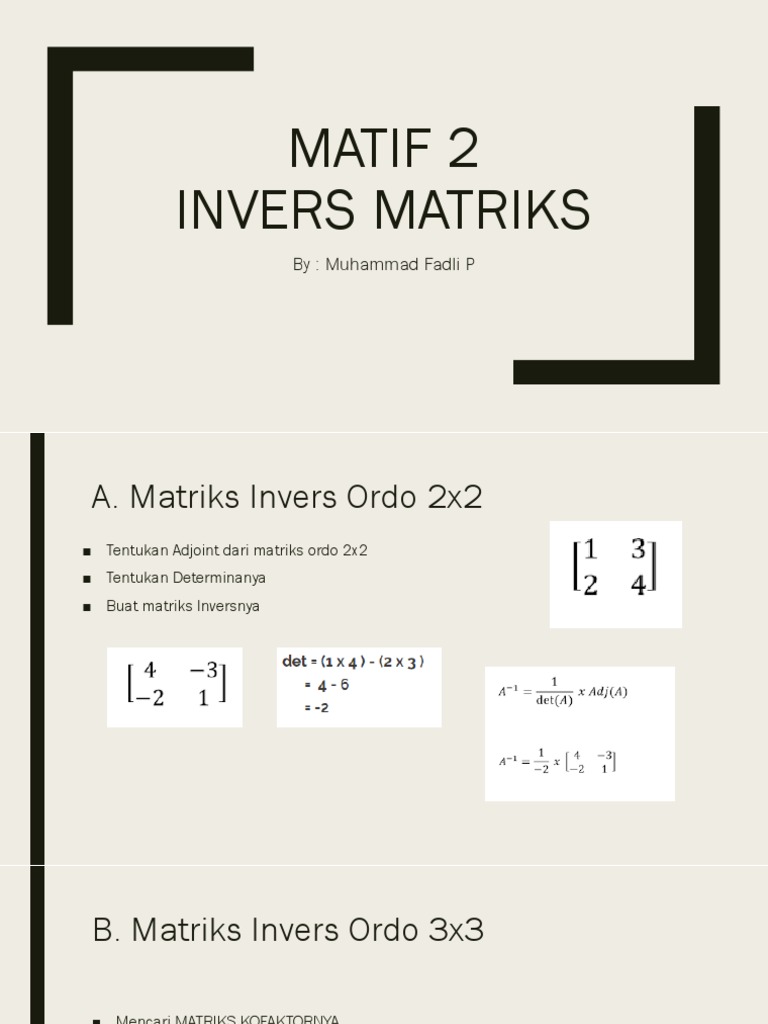 Faktanya metode dan metode penyelesaian masalah dengan matriks tidak jauh berbeda sampai anda memahami rumus matriks terbalik itu sendiri. Selain itu untuk menghasilkan invers matriks dibutuhkan ketelitian dan pengetahuan anda mencari determinan matriks. Misalnya matriks ordo 2 x 3 dapat dikalikan dengan matriks ordo 3 x 3 tetapi tidak bisa dikalikan dengan matriks berordo 3 x 2 karena jumlah baris matriks ordo 3 x 2 tidak sama dengan jumlah kolom matriks ordo 2 x 3. Sebelum kita masuk kedalam cara menentukan invers matriks ordo 3 x 3 sebaiknya anda harus memahamin terlebih dahulu tentang matriks minor kofaktor dan adjoin yang akan saya jelaskan dibawah ini. Kumpulan soal tentang determinan matriks beserta jawaban. Dua buah matriks a dan b dapat dikalikan bila banyak kolom matriks a sama dengan banyak baris pada matriks b.