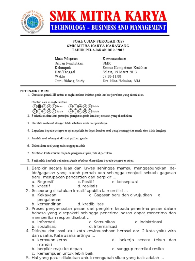 Soal latihan kewirausahaan kelas 10 beserta jawabannya pg dan essay ilmu adalah pengetahuan yang telah disusun secara sistematis dan berlaku umum sedangkan pengetahuan adalah pengalaman yang bersifat pribadikelompok dan belum disusun secara sistematis karena belum dicoba dan diuji. Dibawah ini yang bukan cirri kerja keras adalah. Tidak mengenal waktu dan kesulitan yang dihadapi c. Semangat meraih keinginan b. Soal kewirausahaan kelas xi semester 1 soal uts kewirausahaan kelas xi beserta jawabannya contoh kewirausahaan xi seni budaya smasmk semester 1 berikut ini adalah soal kwu semester ganjil yang telah saya peroleh ketika saya masih kelas xi smk. Entrepreneurship is the result of disciplined systematic process of applying creativity and innovations to needs and opportunities in the marketplace.