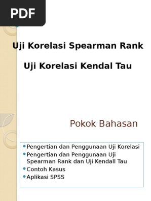 Contoh soal korelasi rank spearman pdf. 5 n jumlah pasangan rank untuk spearman 5 n 30 selesih setiap pasangan rank 2 d nilai korelasi spearman rank 1 6 1 2 2 u u n n d i rumus ini digunakan jika tidak ada nilai yang sama untuk setiap variabel. Rumuscoid setelah sebelumnya kita membahas tentang rumus archimedes kali ini kita akan membahas materi tentang rumus korelasi lengkap kita akan jabarkan secara detail dan lengkap mulai dari pengertian jenis jenis rumus macam macamnya dan contoh soal beserta pembahasannya. Ada 10 orang responden yang diminta untuk mengisi daftar pertanyaan tentang motivasi dan prestasi dalam sebuah kantor. ρ 1 67. 10132008 3 korelasi spearman rho atau sering kali disebut sebagai korelasi tata jenjang digunakan untuk jenis data ordinal baik variabel x maupun y apabila jenis data yang akan di analisis berjenis interval atau rasio maka harus diubah dulu menjadi ordinal teknik korelasi ini masuk kategori statistik non parametrik sehingga tidak harus memenuhi syarat. 10 x 102 1 1 004 096.