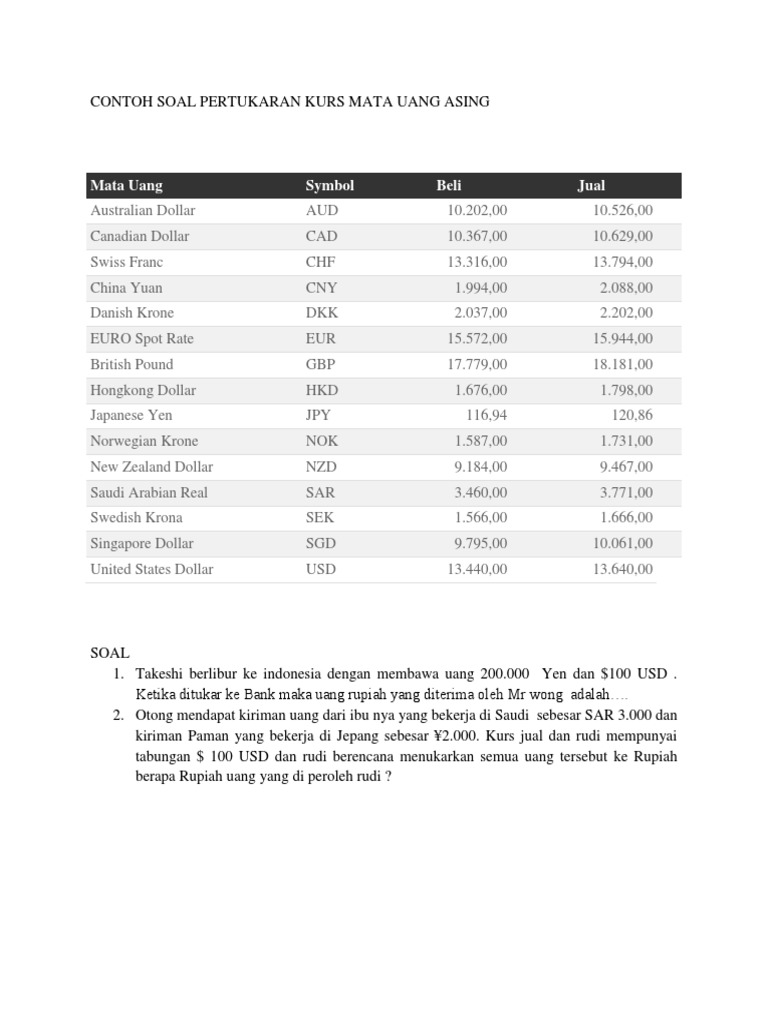 Doc contoh soal dan jawaban investment akm2 widia. Cermat indra kusuma berencana akan berlibur ke austria. Contoh soal soal transaksi kurs jual dan kurs beli simbol mata uang kurs jual kurs beli aud australia 1006400 983900 cad canada 1013400 980400 chf swiss 1371400 1341900 eur eropa 1495900 1463400 gbp inggris 1887800 1846800 hkd hongkong 175800 165800 jpy jepang 1197500 11600 sar saudi arabia 364800 344800 sgd singapura 980100 955100 usd. Australia dollar 1005111 994887. Brunei darussalam dollar 969825 959500. Dalam hal ini pak ujang akan menjual poundsterling dan money changer akan membeli.