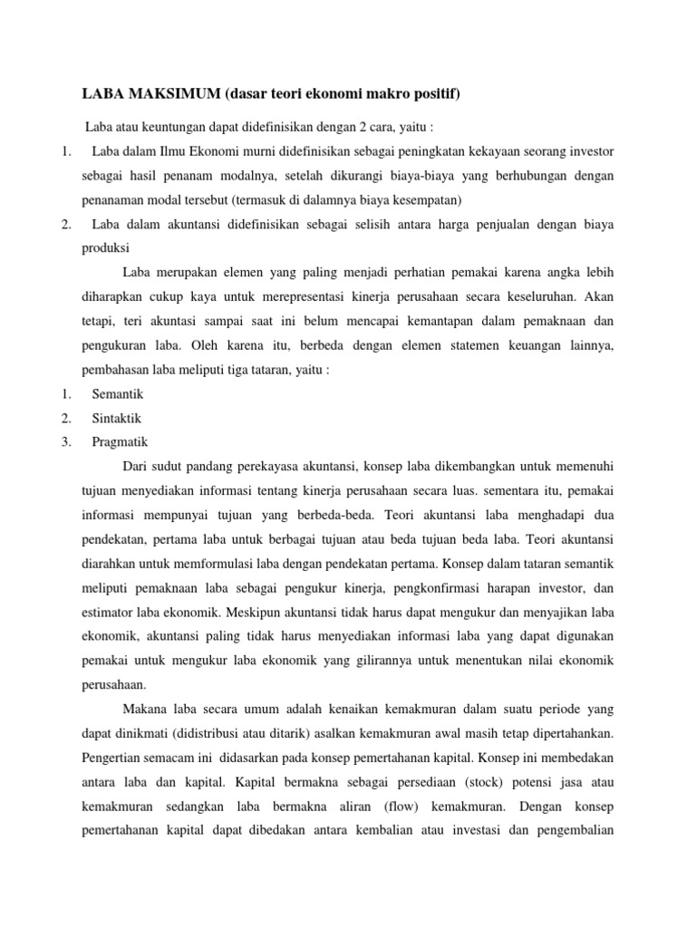 Contoh soal laba maksimum matematika ekonomi. Jika π 0 π maksimum ξ keuntungan maksimum jika π 0 π minimum ξ kerugian maksimum contoh soal jika diketahui fungsi permintaan dari suatu perusahaan p557 02q dan fungsi biaya total adalah tc005q3 02q2 17q 7000 maka. Berapakah jumlah output yang harus dijual supaya produsen memperoleh laba yang maksimum. Berapa laba maksimum yang diperolehnya. Inilah pembahasan selengkapnya mengenai contoh soal laba maksimum matematika ekonomi. 12 keuntungan maksimum dalam teori ekonomi pemisalan terpenting dalam menganalisis kegiatan perusahaan adalah mereka akan melakukan kegiatan memproduksi sampai kepada 1 matematika ekonomi kelompok 10 pend. Secara sistematis laba dapat dirumuskan.