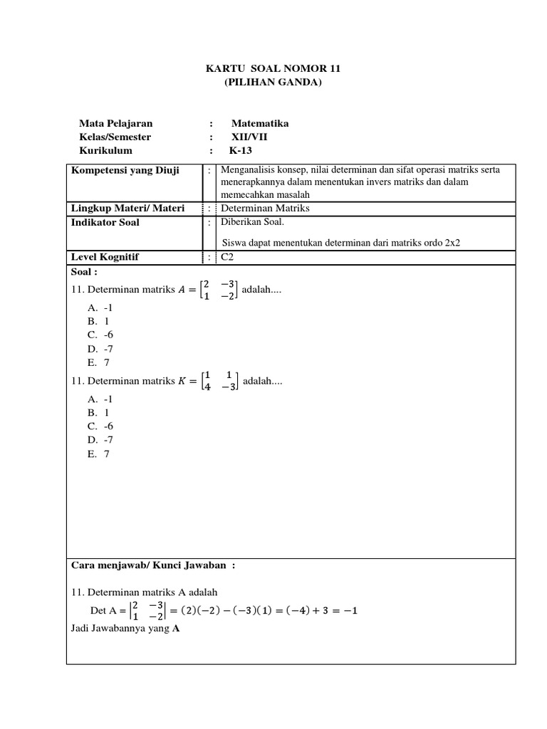 Contoh soal matriks dan jawabannya kelas 11 pilihan ganda. Soal invers matriks smk. Contoh soal matriks dan jawabannya kelas 11 pilihan ganda. Guru sd smp sma contoh soal matriks kelas 11 pilihan ganda. By guru arrasyid posted on november 28 2019 november 28 2019. Aljabar bangun ruang sisi lengkung bilangan bulat fungsi garis himpunan kelas 7 kelas 8 kelas 9 kesebangunan lurus pecahan pembahasan perbandingan persamaan segiempat segitiga smp soal splsv un. Contoh soal matriks dan jawabannya kelas 11.