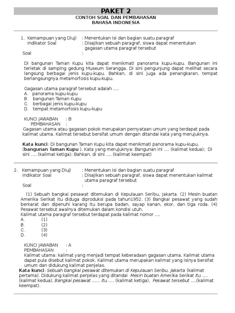 Sementara itu kalimat penjelas adalah rincian dari kalimat utama. Contoh soal menentukan kalimat utama dalam paragraf 1 kementerian pendidikan dan kebudayaan kemdikbud dalam beberapa kesempatan menjelaskan bahwa kurikulum 2013 diprioritaskan pada sekolah sekolah yang memiliki akreditas a atau mantan rsbi. Untuk lebih memahami kedua unsur ini dalam paragraf berikut ini ditampilkan beberapa contoh kalimat utama dan penjelas dalam paragraf bahasa indonesia yang tertera sebagaimana di bawah ini. Latihan soal di bawah ini terdiri dari beberapa soal yang diacak secara komputerisasi. Kalimat utama pada umumnya terletak pada bagian awal paragraf. Kalimat yang mengandung gagasan pokok merupakan kalimat utama.