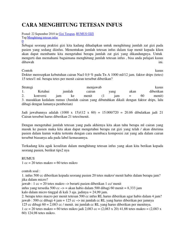 Contoh soal menghitung tetesan infus. Rumus tetesan infus setiap ahli medis harus tahu bagaimana cara menghitung tetesan infus dengan tepat dan benar. Menghitung tetesan per menit terbilang sangat sederhana. Cara menghitung tetesan infus yang benar dan akurat beserta contoh soal dekisugi july 15 2017 contoh pendidikan no comments cara menghitung tetesan infus sebagai seorang yang bergelut di dunia medis pastinya kita harus mengetahui banyak hal baik dari peralatan peralatan medis dan juga cara penggunaannya termasuk mengetahui bagaimana cara menghitung tetesan infus yang benar dan akurat. Cara menghitung cairan infus kali ini kita akan membahas tentang cara menghitung dan berbagai ilmu yang dibutuhkan dalam kehidupan sehari hari. Cara menghitung tetesan infus mikro dan makro kali ini kami akan membahas tentang soal soal informasi yang akan terkait dengan tata cara menghitung dari berbagai ilmu yang kita butuhkan bagaimana sih tata cara menghitung tetesan infus mikro maupun makro. Salah satunya adalah bagaimana cara menghitung tetesan infus makro atau mikro.