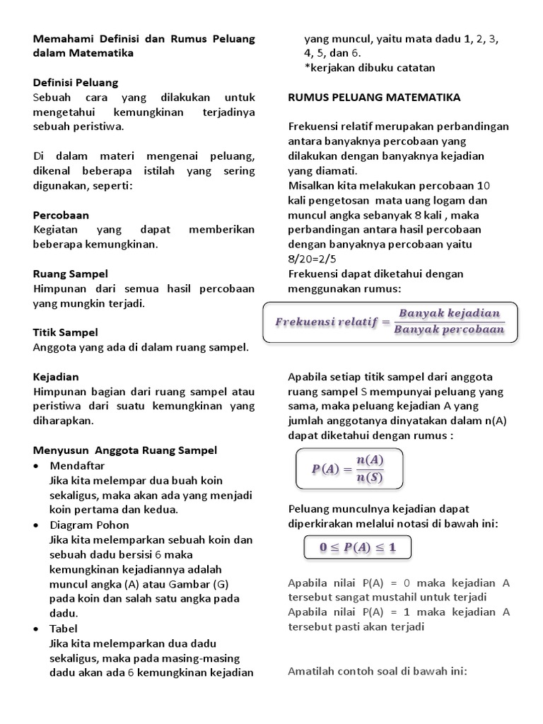 Materi peluang matematika pengertian dan rumus soal terlengkap. Contoh lain dari peluang pada kehidupan sehari hari adalah pelemparan uang koin. Karena memang jenis materi matematika yang satu ini sangat biasa sekali keluar dalam ujian nasional nantinya di tingkat smp. Dua buah mata dadu ditos bersama sama. Dua dadu setimbang dilempar bersamaan. Contoh soal peluang kesempatan ini kami akan mencoba berbagi beberapa contoh soal peluang baik dalam sebuah dadu koin kartu sampai dengan sebuah data statistik yang dimana akan lebih susah bisa sahabat pelajari disini.