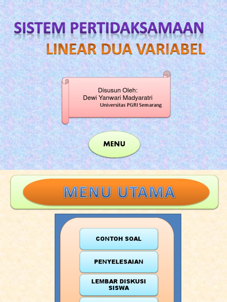 Tentukan himpunan penyelesaian dari 2x 5 11 dengan x bilangan bulat. Titik mana saja bisa digunakan asalkan titik tersebut tidak dilalui oleh garis persamaan. Persamaan linear dua variabel contoh soal spldv sistemnya dosenpendidikancom persamaan linear adalah sebuah persamaan aljabar yang tiap sukunya mengandung konstanta atau perkalian konstanta dengan variabel tunggal. Pertidaksamaan linear ax b 0 ax b 0 ax b 0 ax b 0 penyelesaian. Telah kita ketahui bahwa persamaan linear adalah kalimat terbuka dimana variabelnya berderajat satu dengan menggunakan tanda hubung sama dengan. Pertidaksamaan linear dua variabel spldv merupakan suatu kalimat terbuka matematika yang di dalamnya memuat dua variabel.