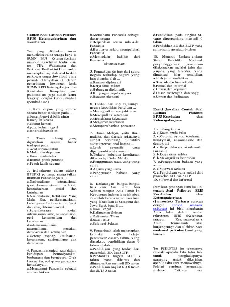 Contoh soal psikotes bpjs ketenagakerjaan pdf informasi guru berikut ini adalah contoh soal psikotes bpjs ketenagakerjaan pdf yang bisa anda download secara gratis di website kami. Contoh soal cpns 2018 dan pembahasannya download contoh soal cpns 2018 beserta jawabanny. Kumpulan soal pelajaran 3 contoh soal psikotes anak tk masuk sd pdf. Admin dari blog contoh soal terbaru 2019 juga mengumpulkan gambar gambar lainnya terkait contoh soal tes bpjs ketenagakerjaan online dibawah ini. Contoh soal tpa beasiswa djarum 2018 anda sedang mempersiapkan diri menghadapi ujian atau tes seleksi lowongan kerja bpjs kami sarankan untuk lebih banyak lagi mempelajari contoh contoh soal tpa dan pilihlah tempat yang sangat terpercaya dan memiliki penghargaan berupa tertimoni dari pelanggan yang sudah lulus tpa.