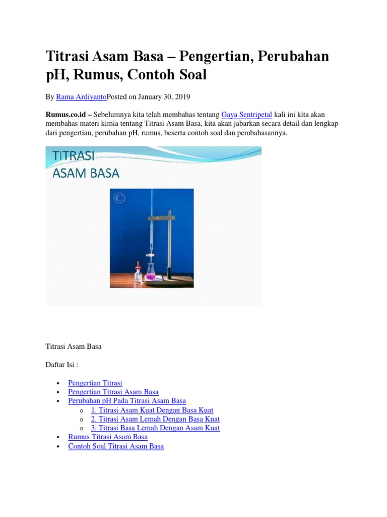 Contoh soal titrasi asam basa dan penyelesaiannya. Pelajari materi asam basa dan titrasi dari contoh soal berikut pembahasannya lengkap disini. Asam adalah akseptor pasangan elektron. Titrasi asam kuat dengan basa kuat. Contoh soal dan pembahasan tentang titrasi asam basa untuk menentukan kadar atau konsentrasi suatu larutan kimia sma kelas 11 ipa. Rumuscoid sebelumnya kita telah membahas tentang gaya sentripetal kali ini kita akan membahas materi kimia tentang titrasi asam basa kita akan jabarkan secara detail dan lengkap dari pengertian perubahan ph rumus beserta contoh soal dan pembahasannya. Inilah beberapa contoh soal dan jawaban tentang titrasi asam basa.