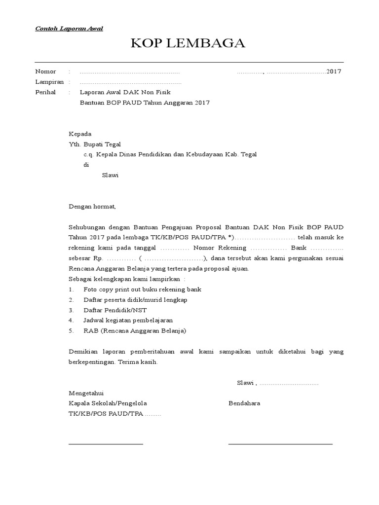 Berikut ini adalah laporan pertanggungjawaban lpjspj bop paudtkkbratpa tahun 2017 yang merupakan kumpulan file dari berbagi sumber tak berkategori tentang lpj bop ra 2019 yang bisa bapakibu gunakan dan diunduh secara gratis dengan menekan tombol download biru dibawah ini. Adapun proposal ini memuat pelaksanaan kegiatan dana bantuan yang dilaksanakan oleh paud al amin. Untuk formatnya bisa anda ambil disini format lpj bop paud ini menggunakan msword. Inilah contoh spj bop paud 2018. Berikut ini adalah download rpp silabus prota prosem kkm skkd ktsp 2006 sd kelas 5 yang merupakan kumpulan file dari berbagi sumber documentktsp 2006ktsp sdrpp silabus tentang contoh spj bop paud 2018 yang bisa bapakibu gunakan dan diunduh secara gratis dengan menekan tombol download biru dibawah ini. Setelah penggunaan dana tertentu pasti dibutuhkan laporan pertanggunhjawaban.