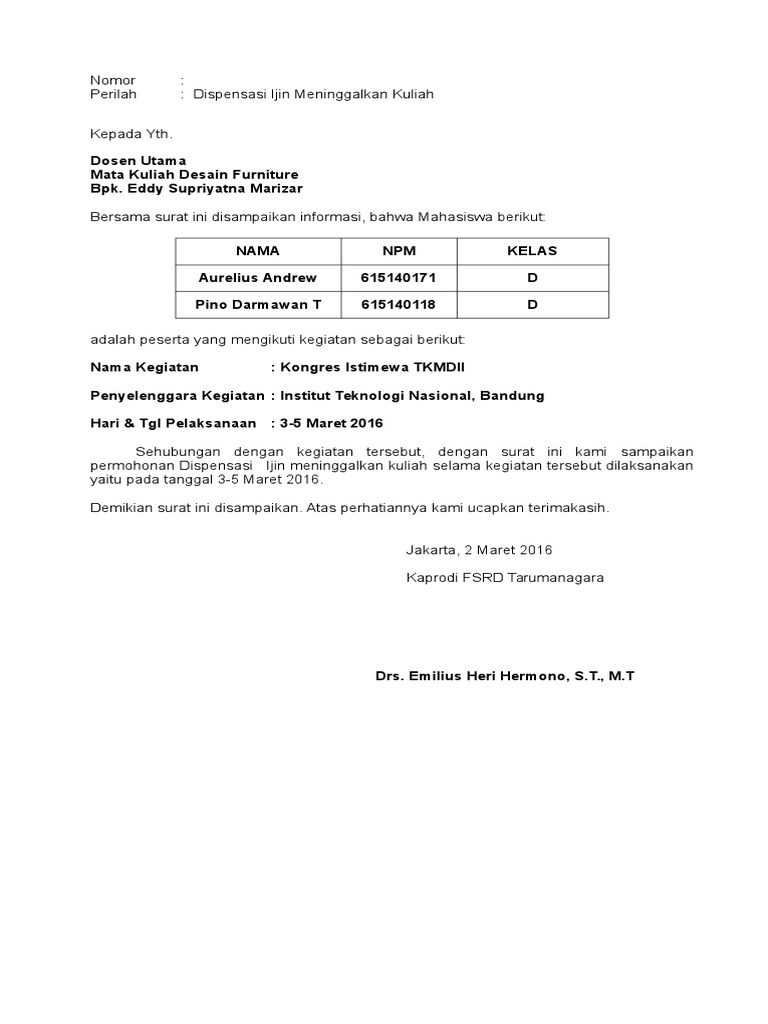 Bambang subardiana utama nip. Surat ini ditujukan kepada dosen pengampu mata kuliah dengan tujuan memberitahukan bahwa mahasiswa yang mengikuti mata kuliah yang diampunya tidak dapat mengikuti kegiatan perkuliahan. Contoh surat dispensasi kuliah jenis surat yang satu ini dipergunakan untuk memberikan keringanan kepada seseorang atau kelompok tertentu secara resmi. Yang harus anda ketahui juga adalah bahwa surat ini merupakan sebuah surat resmi yang mana di dalam penulisannya pun ada beberapa aturan atau kaidah yang harus anda pahami karena jika anda tidak memperhatikan penulisannya maka tentu seseorang yang menerima surat anda tidak segan segan untuk langsung menolak surat yang anda kirimkan karena memang tidak sesuai dengan. Biasanya surat ini akan diberikan seseorang ketika harus izin di pertengahan jam kerja atau sekolah. Contoh surat dispensasi sekolah untuk mengikuti acarasurat dispensasi adalah surat yang dibuat untuk dapat diberikan kepada seseorang ataupun kelompok perusahaan instansi sekolah lembaga dll agar si pembuat surat diperkenankan untuk meninggalkan tugas utamanya sementara karena ada tugas atau kegiatan yang lebih penting.