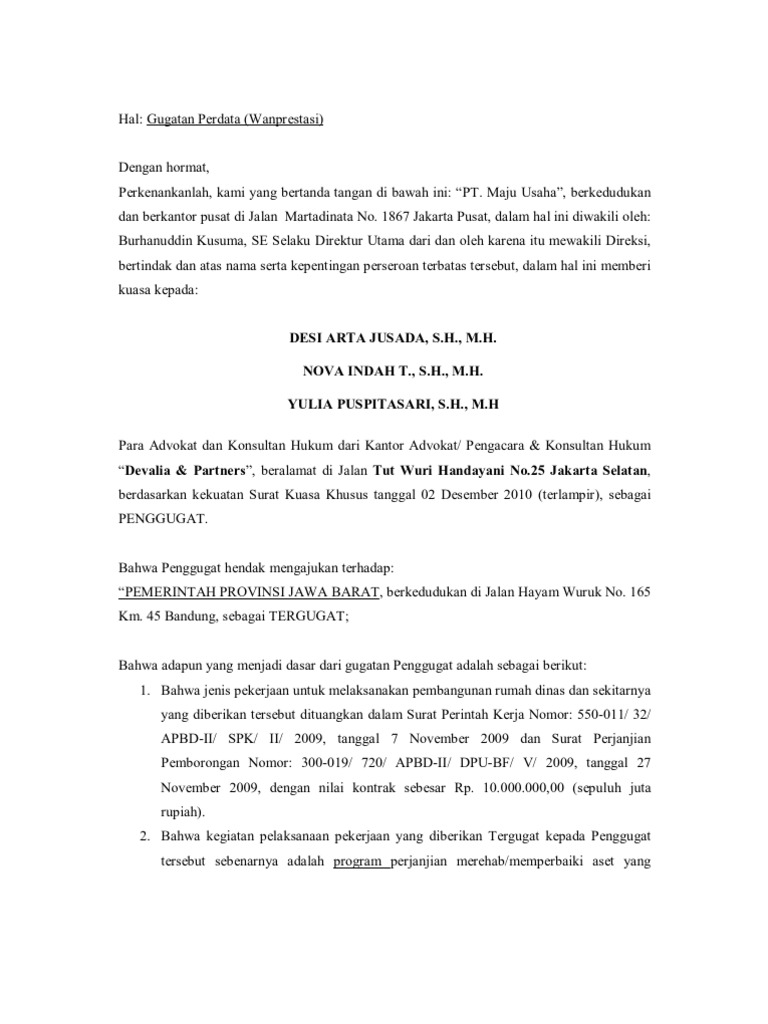 Format surat gugatan perdata wanprestasi meski surat gugatan tidak memiliki format baku sebagai syarat formil namun dalam praktek telah menjadi standar umum bahwa gugatan itu perlu diajukan dalam format tertentu. Kuh perdata yakni di dalam buku ii kuh perdata tentang kebendaan.