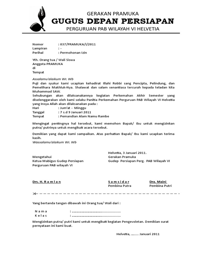 Sangat cocok untuk kamu jadikan referensi. Contoh surat izin orang tua untuk mengikuti kegiatan pramuka ada kalanya kita mengikuti sebuah kegiatan yang memerlukan izin dari orang tua. Demikian surat ini kami sampaikan atas perhatian dan kerjasamanya kami ucapkan terima kasih. By unknown 2039 1 comment.