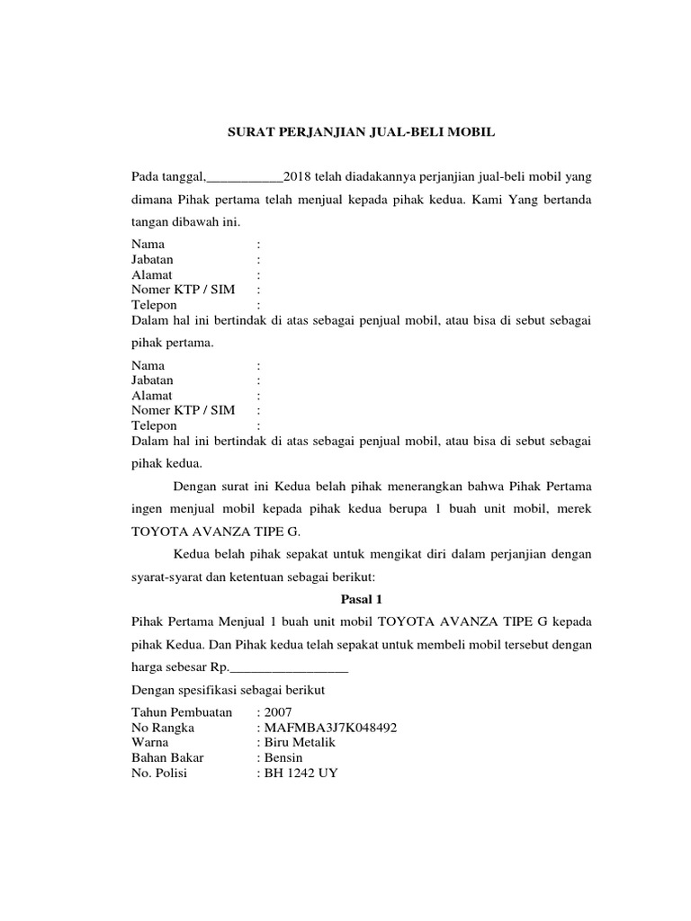 Contoh surat jual beli mobil. Sebab jika tidak dicermati mungkin saja akan ada kesalahpahaman yang timbul dan akan sulit diatasi tanpa adanya pengorbanan dari salah satu pihak yang mengalah. Selain sebagai syarat formal hukum di indonesia surat jual beli mobil juga dapat dijadikan sebagai kwitansi tanda bukti pengesahan bahwa pihak pertama telah memberikan mobil tersebut kepada pihak kedua selaku pembeli. Surat perjanjian jual beli mobil sangat penting untuk diingat ketika anda menandatangani perjanjian pembelian mobil untuk mobil. Surat perjanjian jual beli mobil. Dengan surat perjanjian jual beli mobil ini kedua belah pihak telah sepakat untuk mengadakan transaksi jual beli mobil yang di atur dalam beberapa poin berikut. Surat jual beli mobil bekas tidak jarang bagi konsumen untuk membuat kesalahan dengan menandatangani kontrak tanpa membacanya terlebih dahulu.