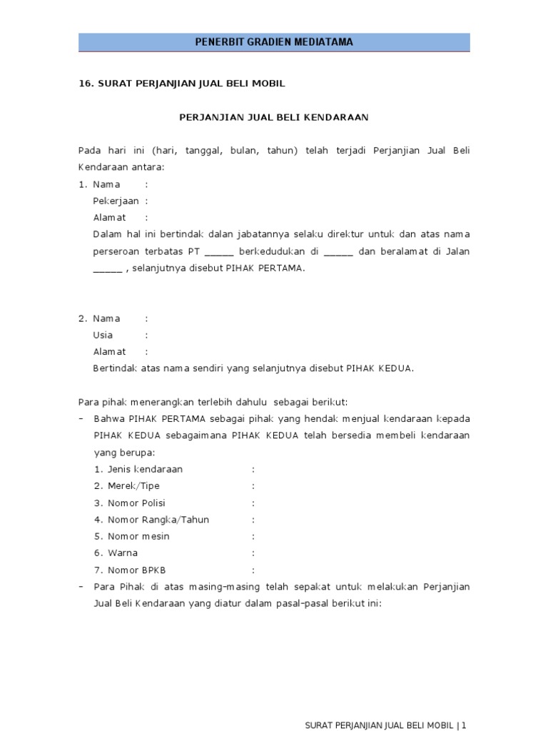 4 ayo berbagi. Surat perjanjian jual beli. Surat perjanjian jual beli mobil. Sebagaimana halnya contoh contoh surat permohonan dan surat gugatan di pengadilan negeri surat perjanjian jual beli mobil yang baik dan benar serta memenuhi syarat formil hukum di indonesia yang mana suatu kegiatan jual beli mobil haruslah dibuatkan suatu perjanjian jika memenuhi kejadian kejadian berikut.
