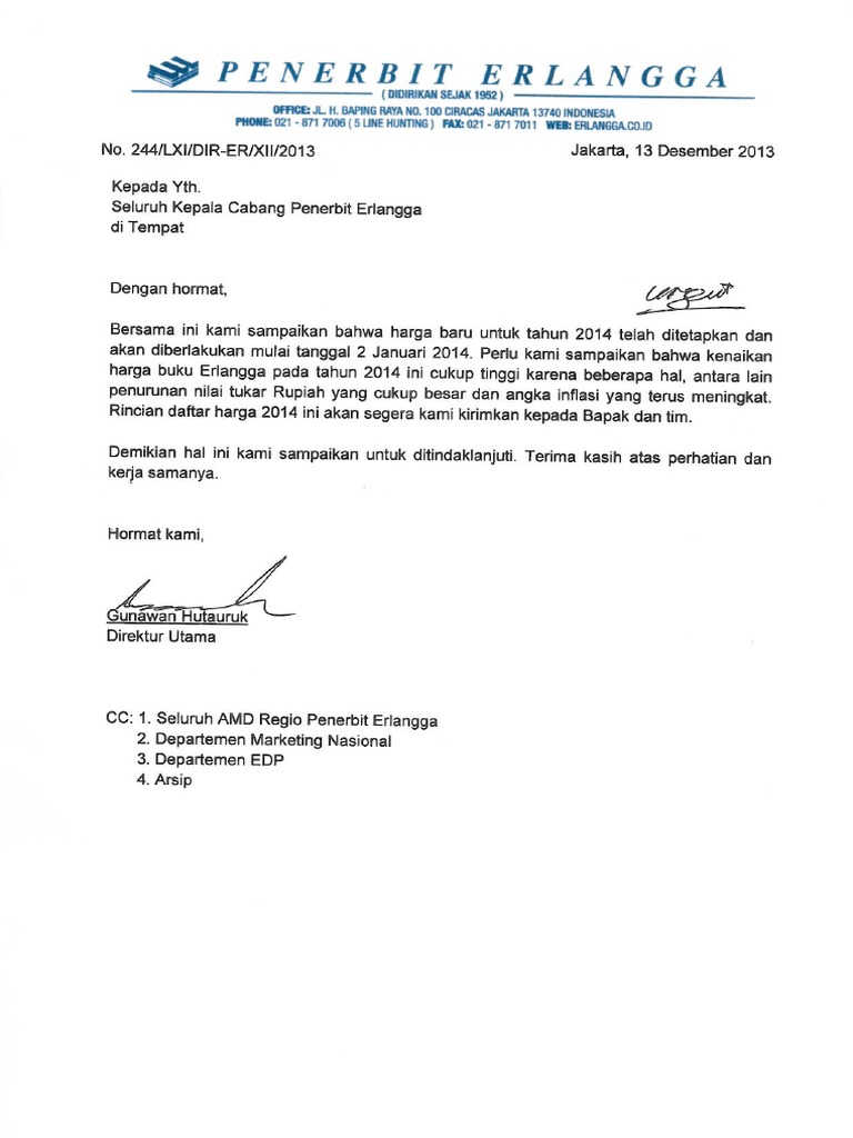 Contoh surat kenaikan harga. Anda bisa mempertahankan harga untuk tidak naik namun dengan mengurangi kualitas produk dan itu akan kurang baik. Contoh surat pemberitahuan kenaikan harga barang kepada pelanggan nah itulah 8 contoh surat pemberitahuan yang bisa menjadi rujukan anda dalam menulis suratcontoh surat pemberitahuan kenaikan harga. Contoh surat penawaran surat penawaran yaitu surat yang ditulis guna menyampaikan maksud suatu perusahaan untuk menjalin kerjasama dengan perusahaan lainnya. Anda bisa mengisi surat pengajuan dengan permintaan pindah tugas permohonan izin sampai dengan permintaan bantuan dari pihak lain untuk seseuatu hal misalnya. Oleh karena ini dalam membuat surat ini sebaiknya disertakan kop surat perusahaan di bagian atas surat. 1 response to contoh surat pemberitahuan kenaikan harga barang cah mbakalan 7 april 2015 at 1743 thanks gantelah memposting contoh surat surat pemberitahuan kenaikan harga barangini sangat membantu saya gan.