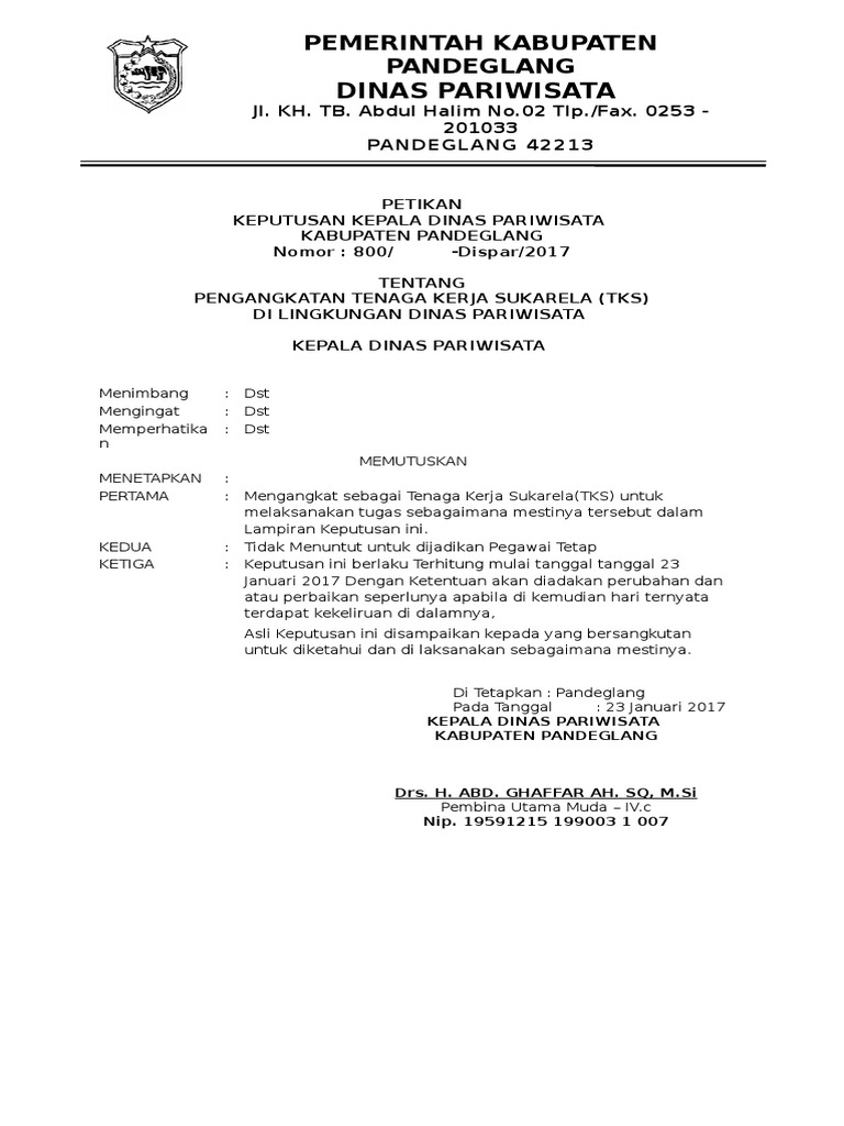 Contoh surat keputusan dinas. Pengertian tujuan fungsi ciri syarat jenis struktur dan contohnya secara umum surat merupakan suatu sarana komunikasi untuk menyampaikan informasi dalam bentuk tulisan pada kertas oleh satu pihak kepada pihak lainnya baik perorangan maupun organisasi. Berdasarkan surat keputusan kepala sekolah mengenai adanya sistem baru untuk ujian semester sekolah untuk kelas xii demi tercapainya pembelajaran yang efektif maka bersama dengan surat ini. Kumpulan contoh surat dinas dan surat keputusan kepala sekolah lengkap surat adalah sebagai alat komunikasi yang menggunakan bahasa tulisan untuk menyampaikan sebuah kabar ajakan pemberitahuan keterangan laporan perintah dan lain sebagaina dari fihak satu ke fihak yang lainnya. Ciri surat ini yang membedakan dengan surat lainnya adalah adanya kop surat dari perusahaan baik pemerintahan atau swasta adannya nomor surat lampiran salam pembuka dan penutup stempel dan tanda tangan perusahaan atau instansi yang. Isi dari surat dinas adalah permasalahan kedinasan seperti pemberitahuan suatu izin penugasan menyampaikan pengumuman permohonan dan lain lain. Tentunya tidak semua hal harus menggunakan surat.