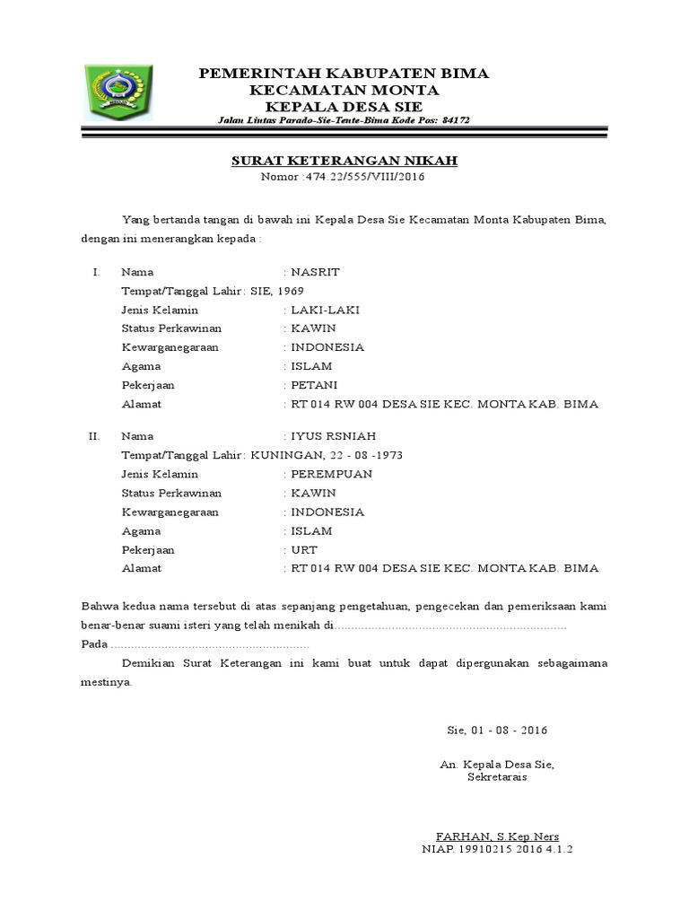 Contoh surat keterangan nikah dari kepala desa. Contoh surat keterangan dari kelurahan kepala desa tentang nikah siri maraknya peristiwa nikah siri telah menjadi contoh yang banyak ditiru masyarakat kita baik yang tinggal di pedesaan maupun kelurahan kelurahan yang ada di kota besar nusantara indonesia dan atau juga untuk penghulu penghulu. Jika salah satu dari kedua parameter tersebut belum terpenuhi maka pernikahan tersebut belumlah dapat diakui secara resmi di negara ini. Download contoh surat keterangan belum nikah lajang dari desa july 15 2020 july 13 2020 by nurul saputro surat keterangan belum menikah adalah surat yang ditulis yang mana digunakan untuk menerangkan bahwasannya seseorang belum menikah. Contoh surat pernyataan nikah siri sebuah pernikahan yang dinyatakan resmi di indonesia haruslah diakui secara sah oleh agama maupun negara. Contoh surat keterangan sakit dari rumah sakit. Pemerintah kabupaten sleman kecamatan kalasan kantor desa selomartani.