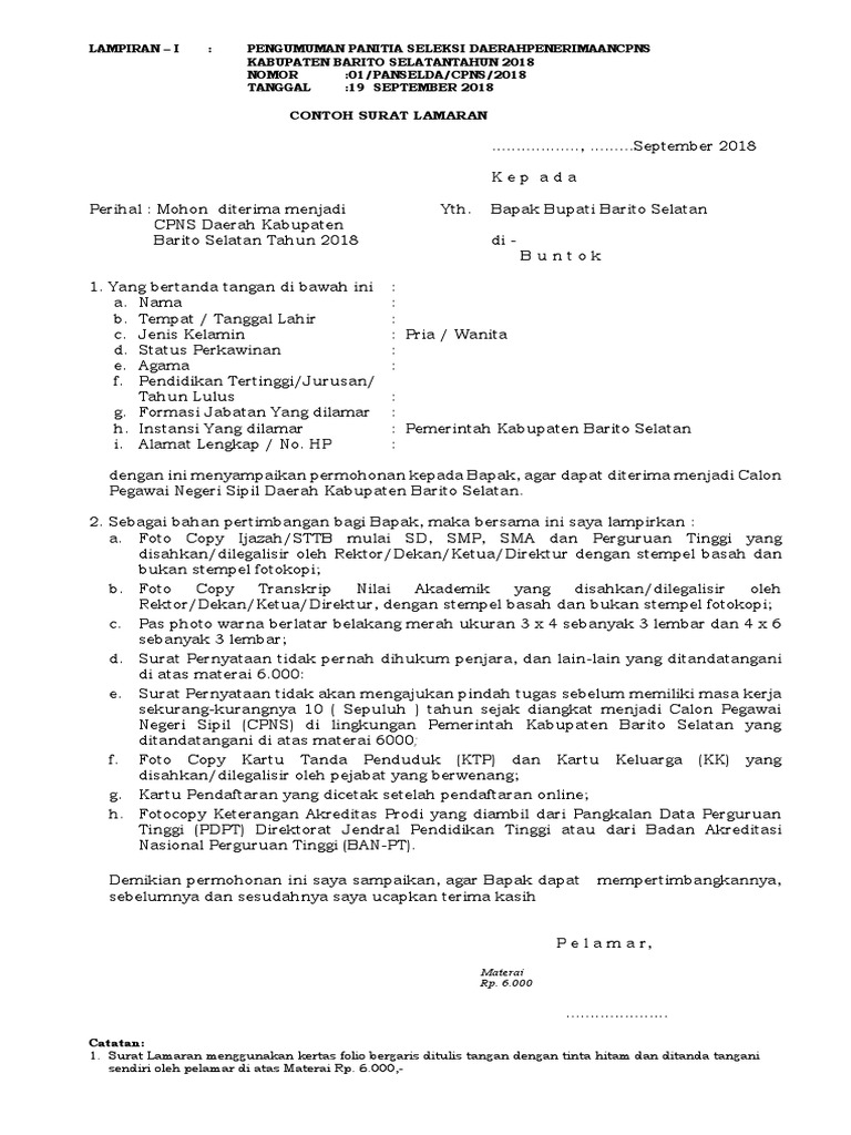 Berdasarkan contoh surat lamaran cpns 2019 yang dibagikan oleh beberapa instansi pusat dan daerah rata rata surat itu memuat beberapa informasi di antaranya yaitu nama pelamar jenis kelamin jenjang pendidikan. Surat lamaran adalah surat resmi yang ditujukan kepada sebuah perusahaaninstansi dengan tujuan untuk mengajukan diri sebagai pekerja atau dalam hal pns adalah abdi negara.