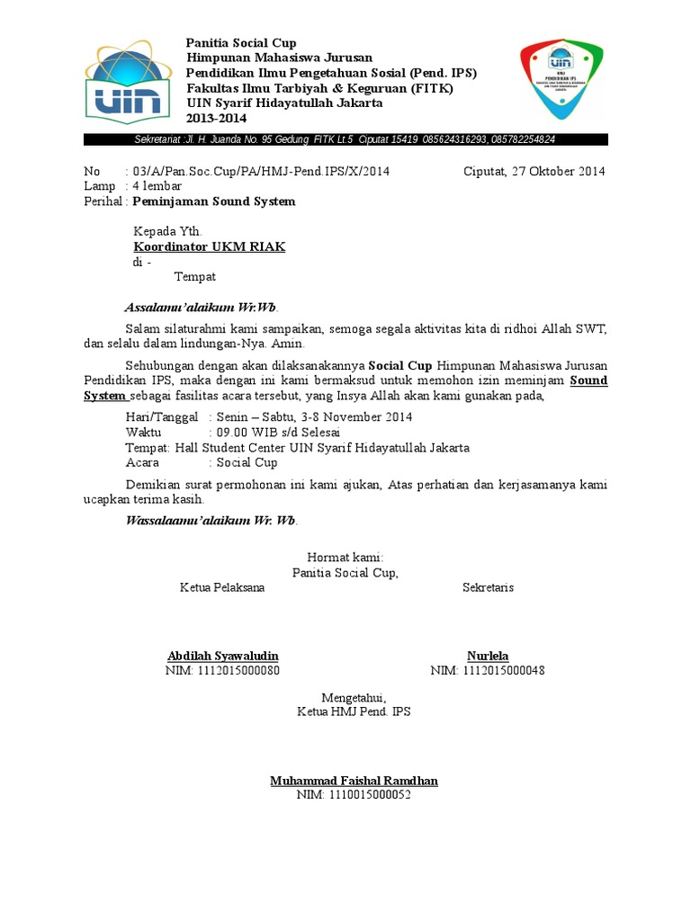 Besar harapan kami atas bantuan ini atas bantuan dan perhatian bapak kami ucapkan terima kasih. Semoga selalu baik baik saja. Demikian surat permohonan peminjaman barang ini kami sampaikan. Pekan olahraga biasanya diadakan satu tahun sekali. 3 seperangkat sound system 4 kursi peserta 300 buah kediri 13 agustus 2015 dewan mahasiswa. Contoh surat peminjaman sound system.