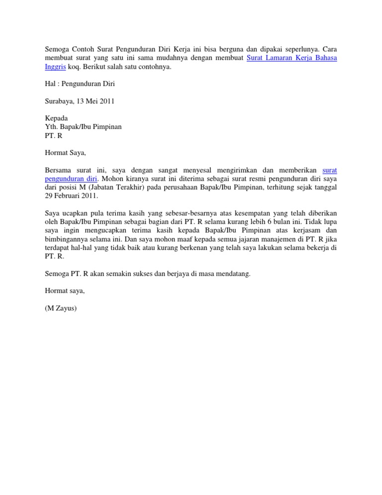 Contoh surat pengunduran diri bahasa inggris. Anda harus menggunakan bahasa yang formal dan sangat sopan. Selain sebab alasan khusus mengajukan pengunduran diri dari tempat kita bekerja secara mendadak merupakan hal yang kurang patut. Naah kali ini kbi akan memberikan beberapa contoh surat pengunduran diri dalam bahasa inggris beserta artinya. Semoga dapat menjadi referensi bagi sahabat kbi yang membutuhkan. Contoh surat pengunduran diri resign surat pengunduran diri atau surat resign adalah surat dalam bentuk formal tentu saja yang anda harus perhatikan pertama kali dalam membuat surat resign adalah bahasa. Contoh surat pengunduran diri dalam bahasa inggris contoh surat resign.