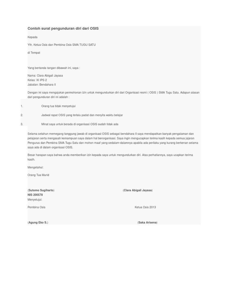Contoh surat pengunduran diri dari osis. Namun terkadang dikarenakan berbagai alasan seseoran harus dan terpaksa untuk mengundurkan diri dari suatu kelompok. Tedapat banyak sekali versi dari surat pengunduran diri organisasi yang beredar di masyarakat mulai dari surat pengunduruan diri osis. Surat ini dipakai bagi anda yang ingin berhenti dari pekerjaan yang anda geluti atau berhenti dari organisasi yang anda ikuti karena sebab tertentu yang mengharuskan anda mengundurkan diri. Download contoh surat pengunduran diri dari organisasi osis sekolah yang dapat anda ajukan sebagai salah satu syarat untuk keluar dari. 15 contoh surat pengunduran diri dari organisasi paling lengkap keputusan untuk mengundurkan diri dari suatu perkumpulan atau kelompok tentu merupakan keputusan yang besar dan bisa memberikan dampak tertentu terhadap diri anda sendiri. Contoh surat pengunduran diri dari organisasi osis himpunan mahasiswa bem partai politik bem dan sebagainya yang baik dan benar.