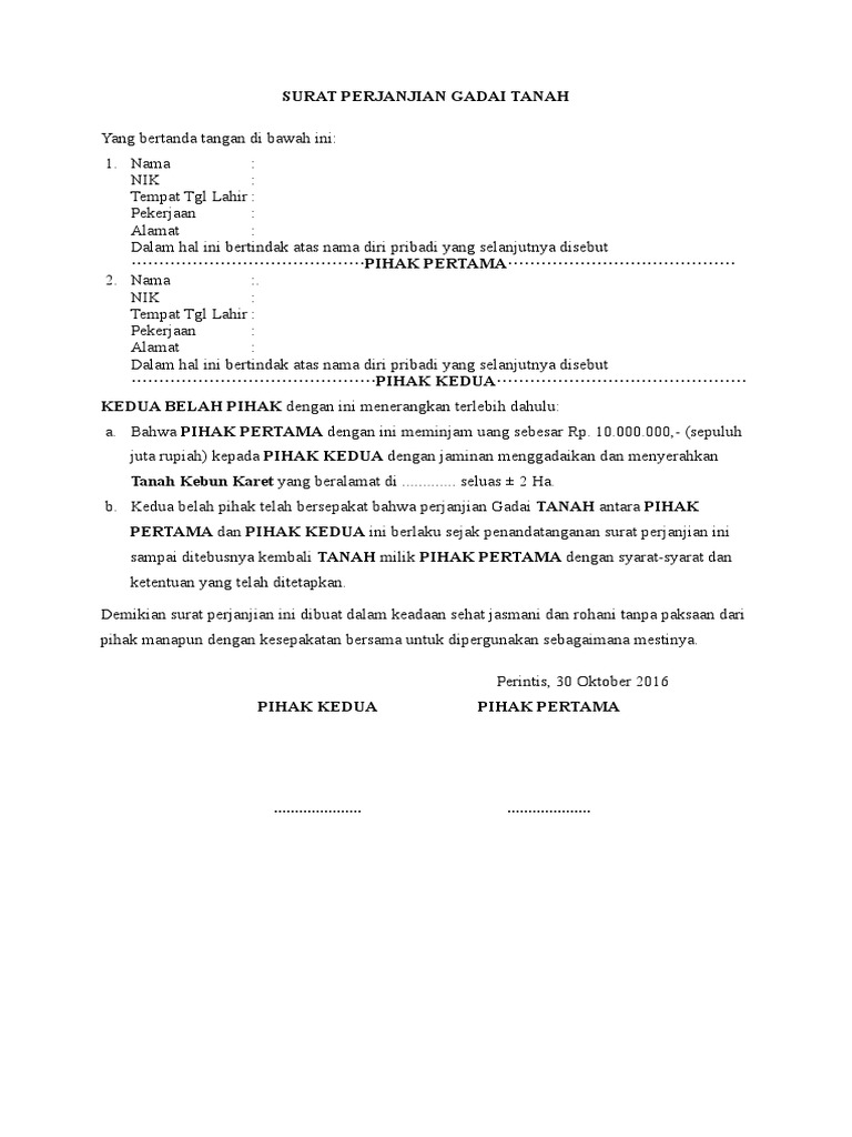 Contoh surat perjanjian gadai tanah. Contoh surat gadai surat keterangan gadai. Yups dalam proses gadai menggadai seharusnya dilengkapi dengan surat perjanjian gadai surat ini berfungsi untuk mencegah hal hal yang tidak diinginkan dalam proses gadai. Sangat menmbantu kami dalam perjanjian gadai. Gadai adalah hak yang diperoleh pemberi pinjaman atas suatu barang yang bergerak yang diberikan kepadanya oleh peminjam untuk menjamin suatu utang. 00 jumlah uang dalam huruf dimana pihak kedua akan membayarkan keseluruhan uang tersebut secara sekaligus bersamaan dengan penandatanganan surat perjanjian gadai ini dan dengan demikian surat perjanjian ini berlaku sebagai tanda bukti pembayaran yang sah atas uang gadai tanah termaksud. Surat perjanjian gadai tanah yang bertanda tangan di bawah ini.