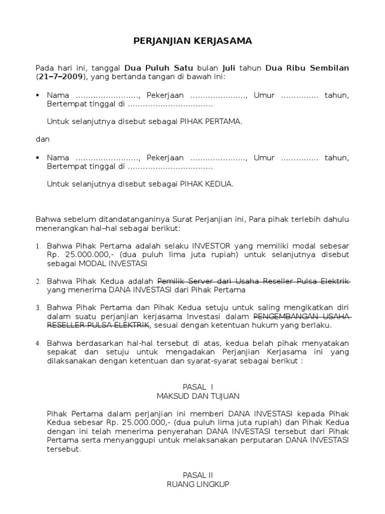 Contoh surat perjanjian kerjasama investasi. Oleh karena itu perlu dibuat surat perjanjian kerjasama investasi. Apabila perusahaan hendak melakukan investasi pada perusahaan lainnya tentunya sebagai pengikat yang sah diperlukan surat perjanjian kerjasama yang baik. Adapun agar hubungan bisnis dari kedua belah pihak tersebut tetap berjalan dengan baik dan lancar maka alangkah baiknya apabila. Dengan dilakukan investasi ini melibatkan beberapa pihak. Contoh surat perjanjian kerjasama investasi modal usaha ini digunakan sebagai keterangan dan pengikat dua belah pihak yang melakukan kerjasama. Contoh surat pernyataan kerja contoh surat dinas contoh surat lamaran kerja pengertian dan penggunaan perjanjian kerjasama secara sederhana.