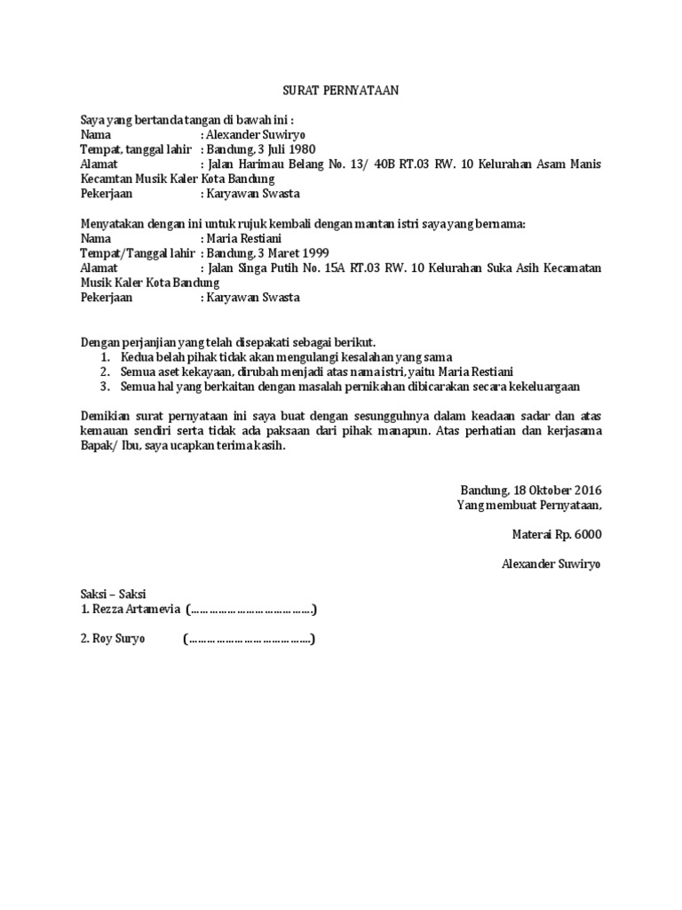 Nama diatas disebut sebagai pihak kesatu. Bedanya keterangan suami istri dibuat oleh kelurahan sedangkan pernyataan ini dibuat sendiri oleh yang bersangkutan. Surat perjanjian antar suami istri. Contoh surat talak 123 ikrar talak dari suami kepada istri. Surat pernyataan persetujuan istri atas poligami suami. Contoh surat pernyataan cerai pada umumnya tidak ada orang yang menginginkan perceraian namun pada kenyatannya masih sering terjadi kasus perceraian dimana mana.