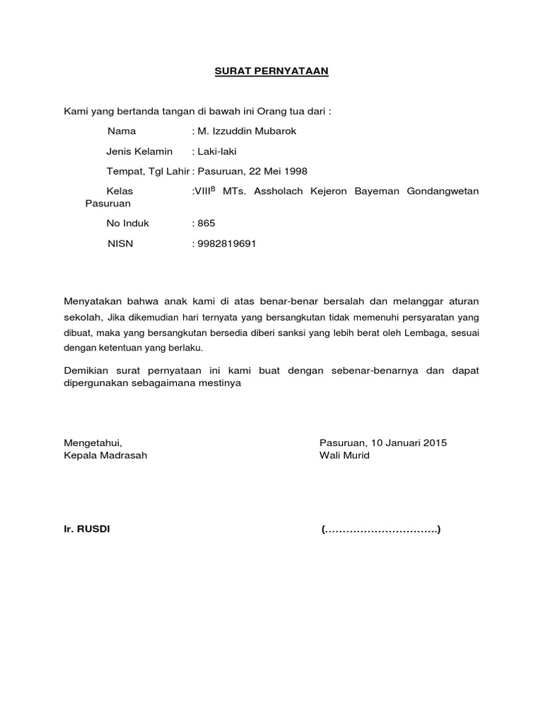 Pernyataan ini ditujukan secara langsung kepada siswa yang sudah melakukan bolos sekolah. Contoh surat pernyataan pernyataan bisa dilakukan secara lisan maupun non lisan atau tertulis.