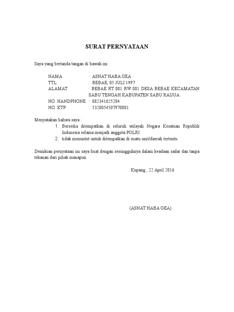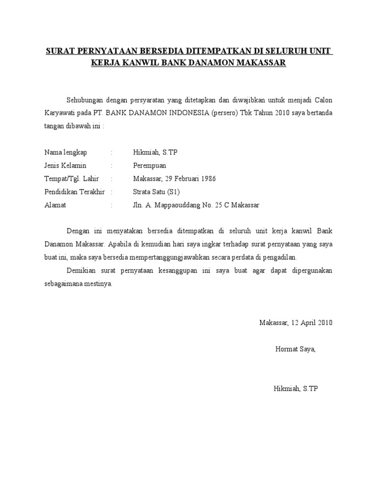 Surat pernyataan bersedia ditempatkan dimana saja adalah surat yang dibuat untuk menyatakan bahwa seseorang akan bersedia untuk ditempatkan dimana saja sesuai perintah dari perusahaan atau instansi tertentu apabila orang tersebut diterima menjadi salah satu pegawai atau karyawan pada salah satu perusahaaninstansi. Contoh surat pernyataan kesanggupan ditempatkan dimana saja di pt.