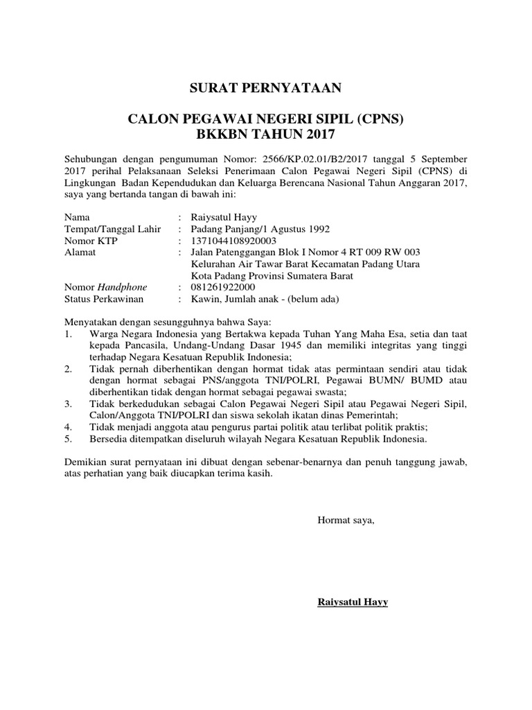 Contoh surat pernyataan cpns 2017. Bagi pelamar cpns 2017 di kemenkumham dan sebagai salah satu dokumen persyaratan yang harus dilengkapi seperti dikutip dari rilis situs cpnskemenkumhamgoid berikut merupakan contoh format surat lamaran dan surat pernyataan cpns 2017 di kemenkumham dengan kualifikasi pendidikan s 1 d 3 dan slta sederajat. Surat pernyataan skb seleksi kompetensi bidang kesamaptaan dalam kondisi kesehatan mengandunghamil bagi kualifikasi. Surat pernyataan cpns 2017 ini merupakan syarat kelengkapan berkas dalam seleksi administrasi cpns 2016. Download contoh surat pernyataan seleksi kesamaptaan cpns kemenkumham 2017. Softgaleri adalah blog yang berbagi informasi kode administrasi dalam surat menyurat administrasi aplikasi dan administrasi guru yang mana file berikut ini adalah kumpulan dari berbagi sumber tentang contoh surat pernyataan cpns mahkamah agung 2017 yang bisa bapakibu gunakan dan diunduh secara gratis dengan menekan tombol. Surat pernyataan cpns merupakan salah satu persyaratan yang harus dilengkapi oleh calon peserta ujian cpns.