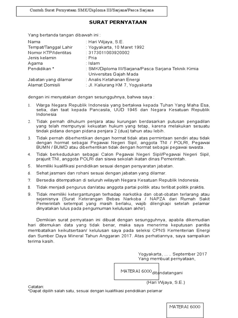 Format surat pernyataan cpns periode 2 jenjang s1 dan d3. Daftar online cpns pendaftaran cpns kementerian hukum dan ham terbaru format terbaru contoh surat lamaran slta d3 d3 papua s1 s1 papua di cpns kementerian hukum dan ham tahun 2017 pendaftaran calon pns tahun 2017 sudah dibuka pada hari selasa lalu yaitu instansi kementerian hukum dan ham yang mana membuka penerimaan sebanyak 17962 formasi. Selain contoh format surat lamaran cpns periode 2 ini admin juga akan meberikan contoh surat pernyataan masing masing jenjang.