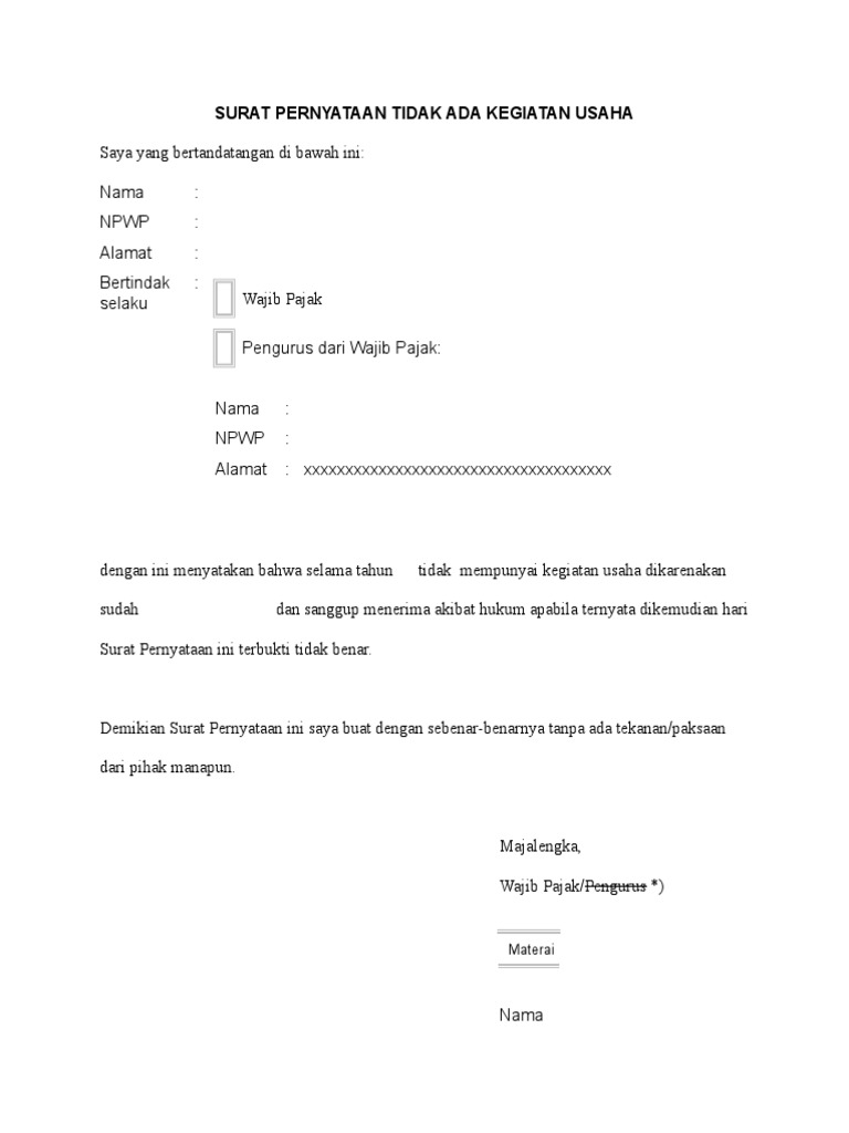 Diisi dengan alamat kegiatan usaha pekerjaan bebas. Contoh surat pernyataan tidak ada kegiatan usaha contoh surat pernyataan tidak ada kegiatan usaha demikian beberapa contoh surat keterangan usaha yang sangat cocok untuk anda yang memiliki usaha sebagai bukti bahwa usaha anda diakui oleh hukum dan negara ini juga diperlukan untuk mendapatkan kredit maupun investasi dari pihak lain. Contoh surat pernyataan pernyataan bisa dilakukan secara lisan maupun non lisan atau tertulis. Diisi dengan tanda tangan wajib pajak orang pribadi wakil wajib pajak. Berikut adalah contoh format dan link download surat pernyataan tersebut. Pernyataan yang diberikan secara lisan sering kali sulit untuk diingat dengan secara rinci.