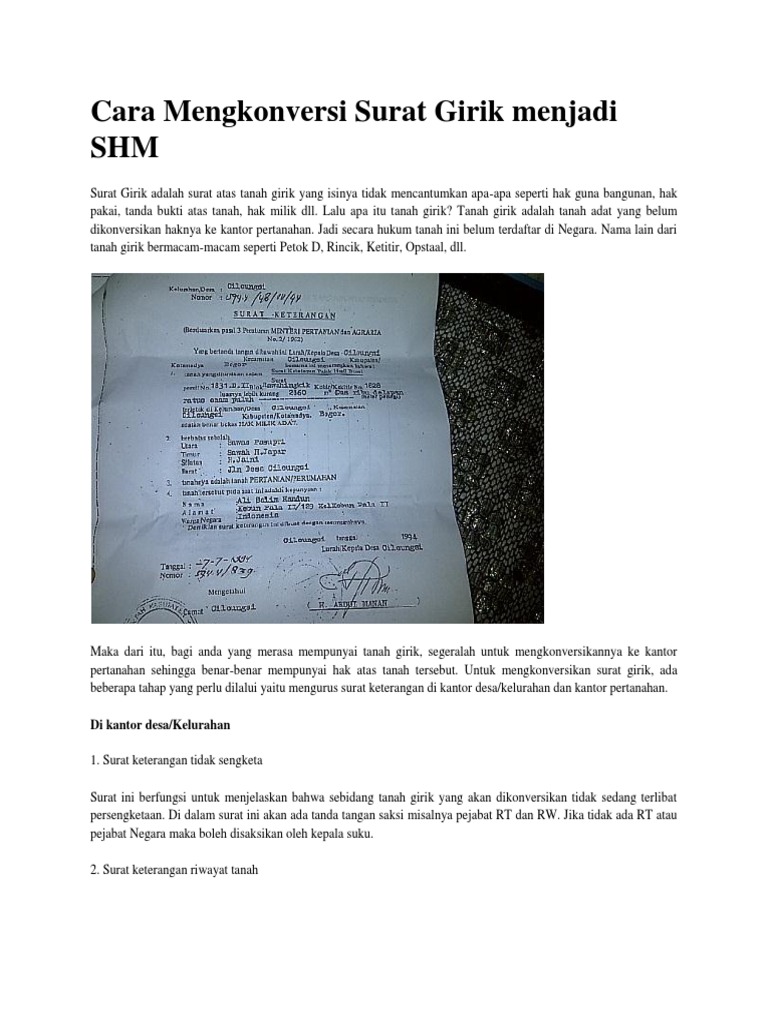 Secara hukum tanah non sertifikat misalnya tanah girik atau tanah berdasarkan surat keterangan tanah skt dari kelurahan dan kecamatan sebenarnya bukan merupakan bukti kepemilikan hak atas tanah. Surat kuasa untuk mengurus semua nya di berikan ke anak nya. 5 tahun 1960 atau uupa undang undang pokok agraria seluruh tanah yang belum memiliki sertifikat termasuk juga tanah girik harus didaftarkan konversi haknya ke negara melalui kantor pertanahan setempat. Dibuat oleh lurah untuk tanah girik leter c dibuat oleh kanwil bpn setempat untuk tanah verponding indonesia surat pernyataan yang diketahui lurah bahwa tanah yang dimohon pengakuanpenegasan haknya tidak dalam keadaan sengketa tidak dijaminkan belum pernah dialihkan kepada pihak lain dan belum pernah. Girik atau petok berfungsi untuk menunjukkan penguasaan atas lahan dan keperluan perpajakan. Pengertian tanah girik tanah girik atau yang seringkali lebih populer dengan sebutan tanah adat ialah merupakan sebuah status tanah yang belum di konversikan ke salah satu hak atas tanah tersebut seperti misalnya sertifikat hak milik atau shm hak guna bangunan hak pakai dan lain sejenisnya dimana status dari tanah tersebut belum di buatkan sertifikat kepemilikan tanah di badan pertanahan.