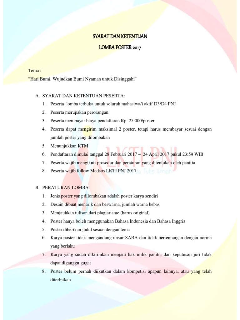 Contoh syarat dan ketentuan. Setiap peserta diwajibkan melunasi biaya pendaftaran sebelum pendaftaran ditutup. Sebagai pengguna platform sebagaimana didefinisikan di bawah anda diwajibkan untuk membaca syarat dan ketentuan penggunaan ini ketentuan penggunaan dan kebijakan privasi yang terlampir dengan hati hati dan seksama sebelum mengunduh mau pun menggunakan setiap fitur danatau layanan yang tersedia dalam platform. Syarat dan ketentuan karya foto. Peserta diwajibkan membayar biaya pendaftaran sebesar rp 30000 per peserta. Syarat dan ketentuan penggunaan. Tapi bagi orang awam memerlukan contoh surat perjanjian yang baik agar surat yang dibuat sah dan memiliki kekuatan hukum yang mengikat pihak yang sepakat dengan perjanjian tersebut.
