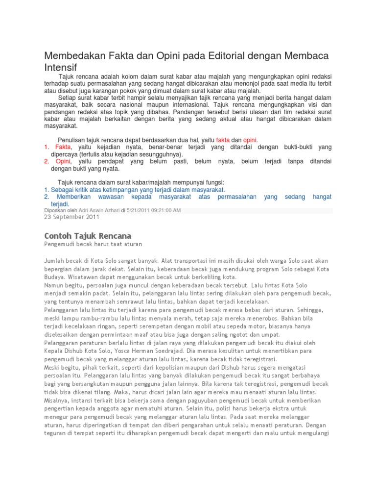 Soal soal fakta dan opini beserta pembahasannya. Dan artikel ini hanya khusus membahas contoh tentang pendidikan. Tajuk rencana adalah artikel pokok dalam surat kabar yang merupakan pandangan redaksi terhadap peristiwa yang sedang menjadi pembicaraan pada saat surat kabar itu diterbitkan. Yang jelas tajuk rencana biasanya menjelaskan berita dan akibatnya pada masyarakat. Dalam tajuk rencana biasanya diungkapkan adanya informasi atau masalah aktual penegasan pentingnya masalah opini redaksi tentang masalah tersebut kritik dan saran atas permasalahan dan harapan redaksi akan peran. Biasanya dalam tajuk rencanaeditorial diungkapkan adanya informasi atau masalah aktual penegasan pentingnya masalah.