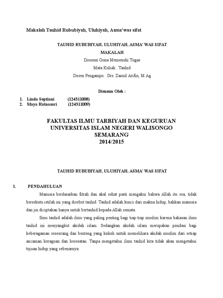 Tauhid rububiyah tauhid uluhiyah serta tauhid asma wa sifatsetiap macam dari ketiga macam tauhid itu memiliki makna yang harus dijelaskan agar menjadi terang perbedaan antara ketiganya. Rumusan ini tercermin dalam kalimat syahadat yaitu laailaaha. Lebih dari itu tauhid harus tercermin dalam kehidupan sehari hari. Penerapan tauhid dalam kehidupan. Tauhid uluhiyah penjelasan ulama tentang tauhid uluhiyah. Allah tidak membutuhkan segala sesuatu.