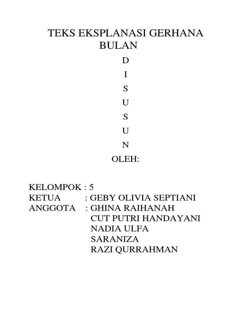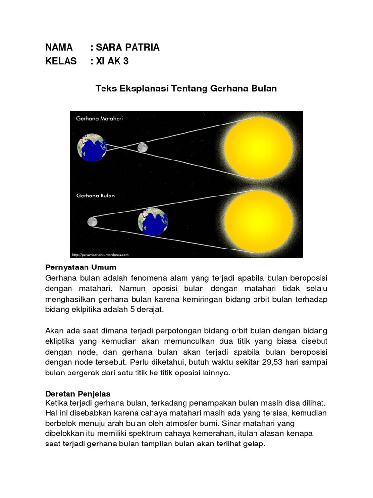 Contoh teks explanation tentang gerhana bulan. Pernyataan umum pembuka dalam pernyataan umum biasanya berisi tentang pernyataan terhadaap tema atau topik yang diangkat dan biasanya singkat supaya tidak. Contoh teks eksplanasi gerhana matahari fenomena alam ini terjadi ketika posisi bulan terletak di antara bumi dan matahari sehingga menutupi sebagian atau seluruh cahaya matahari. Gerhana matahari adalah suatu fenomena alam dimana posisi matahari bulan dan bumi sejajar pada satu garis lurus. Gerhana matahari terjadi ketika bayangan bulan bergerak menutupi permukaan bumi. Contoh teks eksplanasi tentang bencana alam tanah longsor longsor adalah sebuah peristiwa dimana terjadinya gerakan tanah atau biasa disebut geologi yang terjadi karena adanya pergerakan masa batuan atau tanah dengan berbagai tipe dan jenis seperti jatuhnya bebatuan atau gumpalan besar tanah.