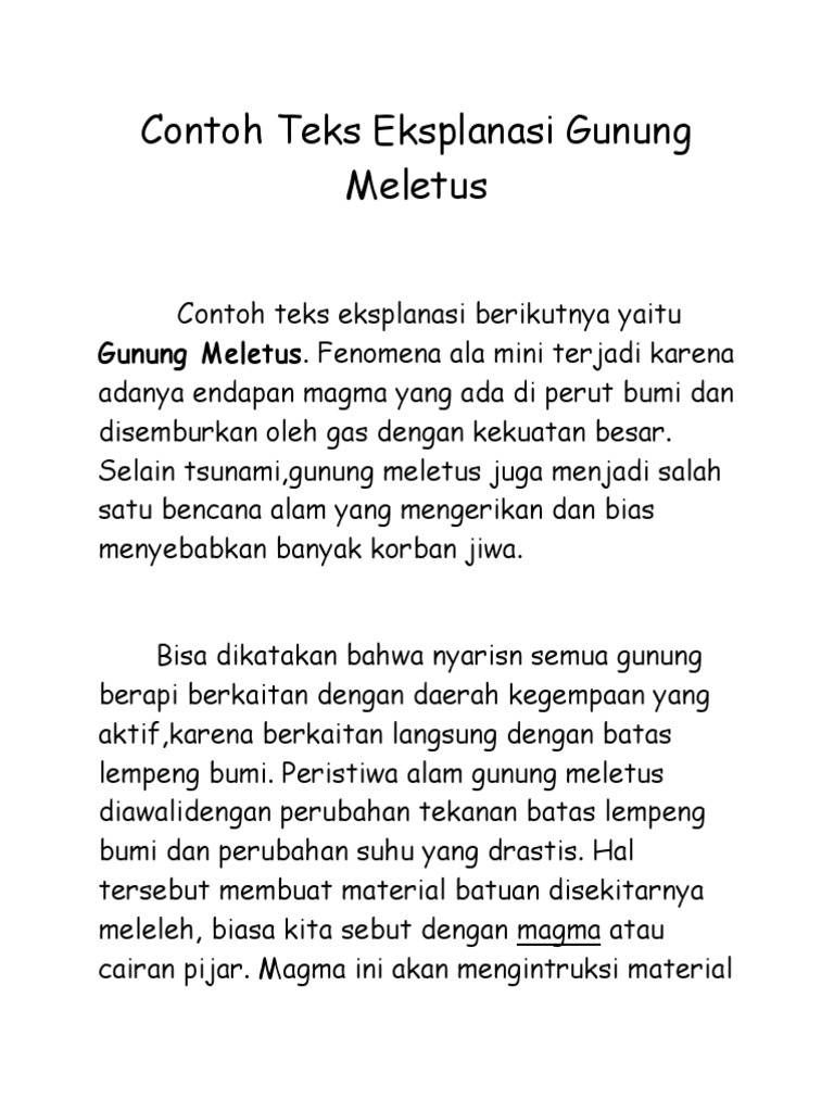 Contoh teks eksplanasi gunung meletus. Contoh teks eksplanasi teks merupakan media siswa untuk menuliskan isi dan manfaat yang ada dalam teks tersebut tek s eksplanasi merupakan teks yang digunakan pada pembelajaran bahasa indonesia kelas vii pada kurikulum 2013. Contoh explanation text tentang gunung meletus bahasa inggris peristiwa gunung meletus sering terjadi di beberapa daerah di indonesia khususnya di daerah yang terdapar gunung berapi yang masih aktif. Dari berbagai macam jenis bencana alam yang pernah terjadi bencana gunung meletus akan dijadikan sebagai contoh teks eksplanasi bencana alam pada bagian ini. Contoh teks eksplanasi tentang gunung meletus teks eksplanasi adalah teks yang menjelaskan tentang proses terbentukterjadinya suatu fenomena baik alam maupun sosial. Teks eksplanasi sendiri didasarkan pada kejadian atau peristiwa yang ada di dunia. Contoh teks eksplanasi selamat datang di portal hidup simpel yah pada kesempatan kali ini kita akan membahas tentang contoh teks eksplanasi.