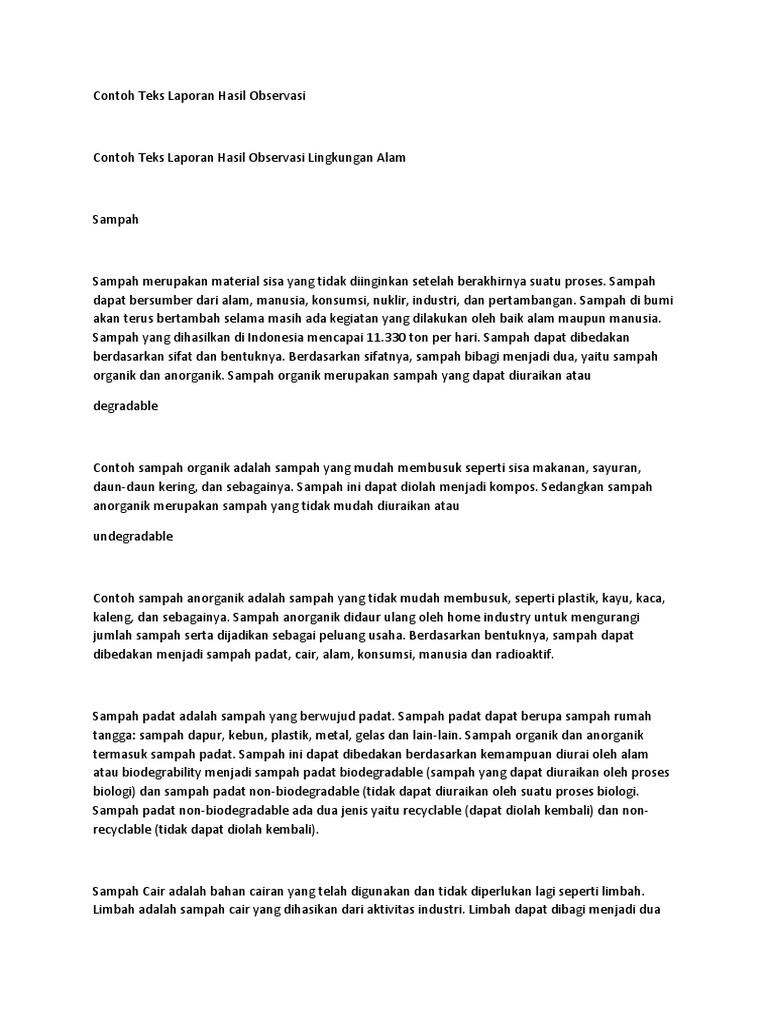 Lingkungan hidup adalah kesatuan yang terbentuk dari saling terhubungnya ruang benda dan makhluk hidup di dalamnya. Sedangkan untuk teks hasil observasinya mempunyai pengertian isi teks yang menjelaskan tentang suatu informasi baik itu hewan tanaman fenomena alam hasil karya manusia serta fenomena sosial yang sesuai. Sebelum masuk ke pembahasan khusus mengenai contoh teks laporan hasil observasi tentang tumbuhan dan tanaman kita ketahui struktur penyusun teks ini terlebih dahulu sehingga kita bisa menganalisa lebih lanjut. Contoh teks laporan hasil observasi singkat. 5 contoh teks hasil laporan observasi singkat padat dan jelas uziyanuar berbicara tentang contoh teks observasi merupakan teks yang didalamnya ada informasi tentang fakta dan kesimpulannya mengenai suatu objek yang telah diteliti langsung di lapangan. Pernyataan umum klasifikasi adalah pembuka atau pengantar mengenai hal yang dilaporkan.