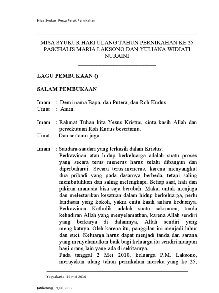 To love another person is to see the face of god. Ucapan syukur dan terima kasih sebaiknya disampaikan langsung oleh mempelai foto bersama walaupun sepele sebaiknya ini diatur mengingat waktu ini adalah naskah buku misa perkawinan yang kami buat sendiri dengan imprimatur dari rp reverendus pater ja.