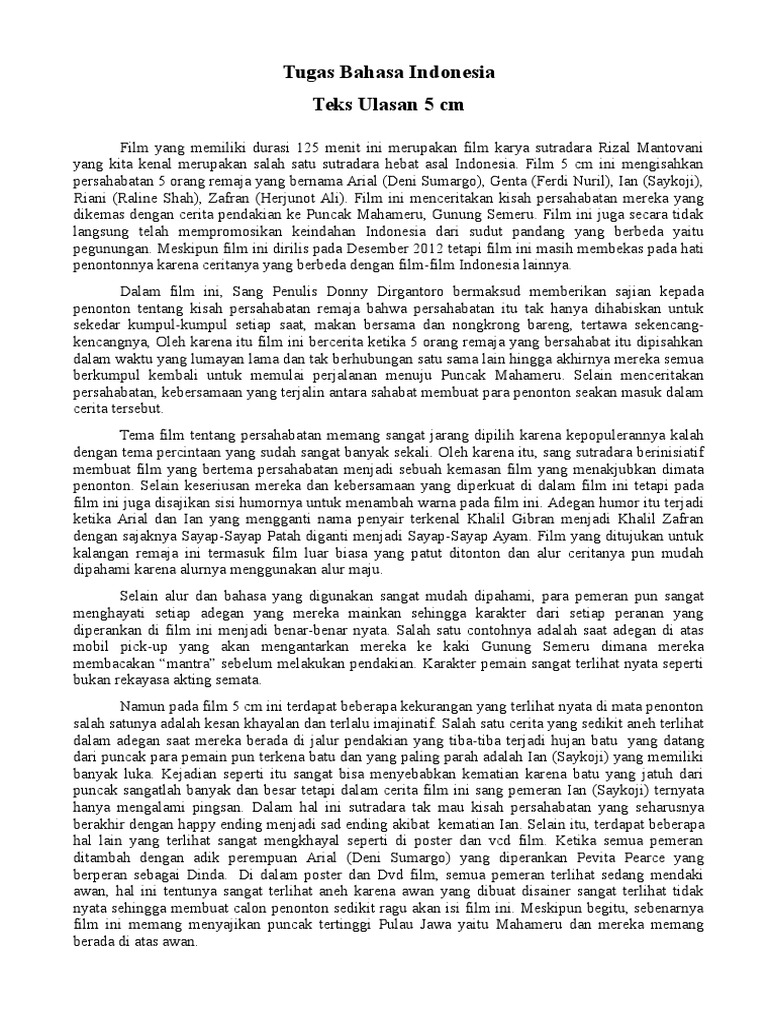 Jadi kita akan mengupas mulai dari sinopsis novel 5 cm unsur unsur intrinsik dan ekstrinsik yang terkandung di dalamnya beserta penjelasan singkat bagaimana cara meresensi novel yang baik dan benar. Oleh sebab itu kami juga ingin menyampaikan rasa terima kasih kepada semua pihak yang telah membantu kami dalam pembuatan laporan teks ulasan ini. Ketika mengulas suatu karya pengulas harus bersikap kritis agar hasil ulasannya dapat memberikan kontribusi bagi kemajuan karya tersebut. Teks ulasan film 5 cm by siswa on. Teks ulasan adalah suatu teks yang berisi ulasan penilaian atau review terhadap suatu karya seperti film drama atau sebuah buku. Dalam penulisan teks ulasan tersebut harus sesuai dengan struktur yang berlaku.