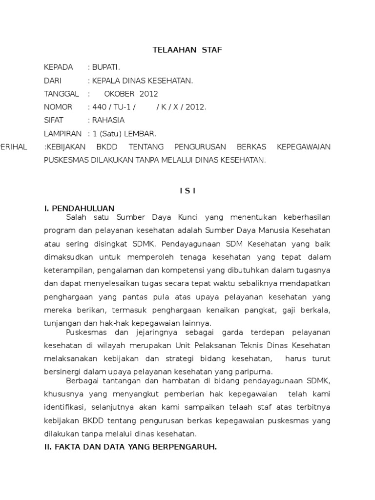 Contoh telaahan staf kepegawaian. Demikian telaahan staf ini disampaikan putusan dan pertimbangan selanjutnya kami serahkan kepada bapak terima kasih. 19660914 199803 2 003 tembusan yth. Dengan hormat kami beritahukan kepada bapak bupati bahwa berdasarkan data yang tertera pada ijazah dan surat keputusan pengangkatan kami sebagai calon pns pegawai negeri sipil dan surat kepegawaian lainnya. Doc contoh telaahan staf penataan pns cipta karya. Harapan saya dapat memberikan manfaat wacana masukan ataupun konsep inovatif bila para blogger juga mengalami permasalahan yang sama. Kepala dinas pendidikan pemuda dan olahraga.