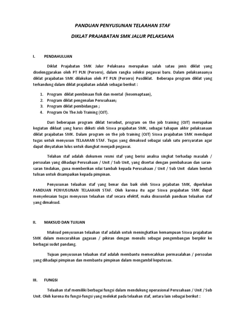 Komandan dan bahkan setiap perwira dapat menyampaikan pendapat dan saran secara tertulis dalam bentuk telaahan staf. Jump to page. Kepala bagian umum 15 april 2019 090650um tup1v2019 biasa 1 satu halaman. You are on page 1 of 2. Unduh sebagai docx pdf txt atau baca online dari scribd. Doc contoh telaahan staf penataan pns cipta karya.