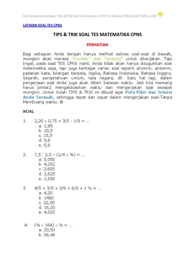 Bagi sejumlah orang mengerjakan soal matematika dasar psikotes merupakan hal yang cukup sulit untuk dikerjakan. Baiklah guna membantu anda di dalam menemukan serta mencari bahan belajar contoh soal tes kerja matematika dasar maka berikut ini akan saya berikan secara gratis untuk anda.