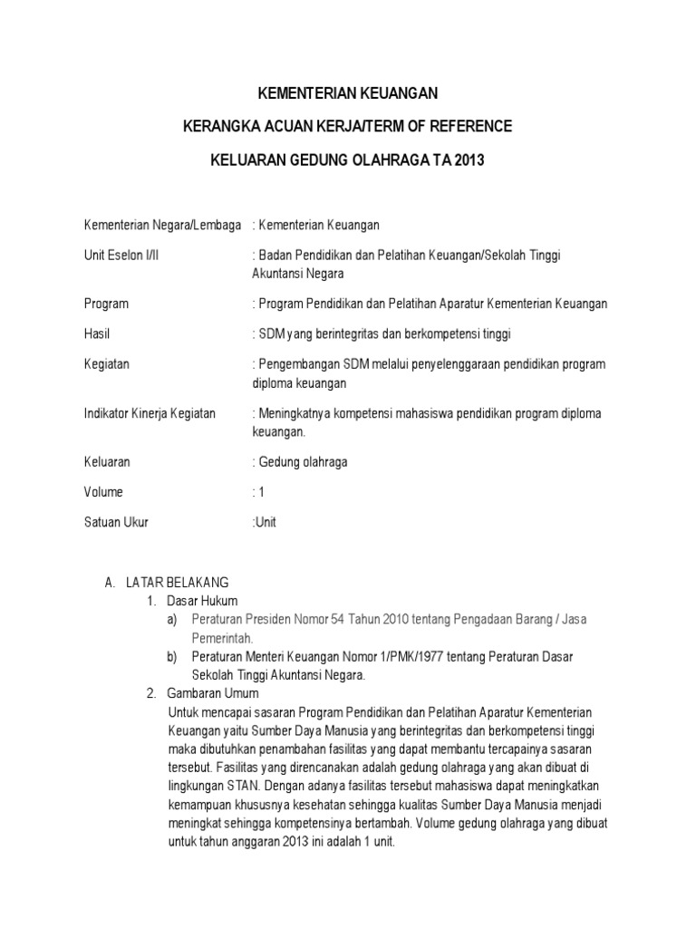 Kerangka acuan kerja atau juga disebut term of reference tor pengadaan barang adalah suatu dokumen yang menginformasikan gambaran latar belakang tujuan ruang lingkup dan struktur sebuah proyek pengadaan barang yang telah disusun oleh skpddinas terkait. Kerangka acuan kerja kak pengadaan barang pekerjaan. Berikut ini adalah contoh kak pengadaan alat peraga pendidikan welding simulator yang terdiri dari latar belakang mengapa diperlukan belanja modal pengadaan welding simulator dasar hukum tujuan dan maksud belanja pengadaan barang tersebut hingga analisa kebutuhannya. Format kerangka acuan kerja kak pengadaan barang pengadaan eprocurement. Pengadaan barang kuasa pengguna anggaran. Khaerudin hs spi msi satker.