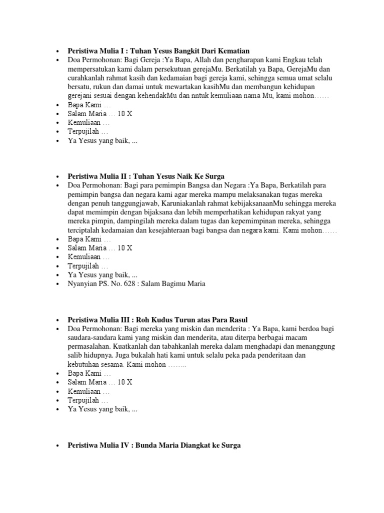 Berikut contoh doa rosario peristiwa mulia yang disertai doa doa permohonan doa umat. Selama bulan maria berlangsung umat katolik sejagad raya mendedikasikan satu doa khusus yang di sebut dengan doa rosario guna menghormati kesucian perawan maria. Bapa ajarilah kami selalu mengikuti kehendak mu. Peristiwa sedih doa rosario yesus berdoa kepada bapa nya di surga dalam sakratul maut. Ya yesus yang baik ampunilah dosa dosa kami. Bagaimanakah ujud dalam doa rosario.