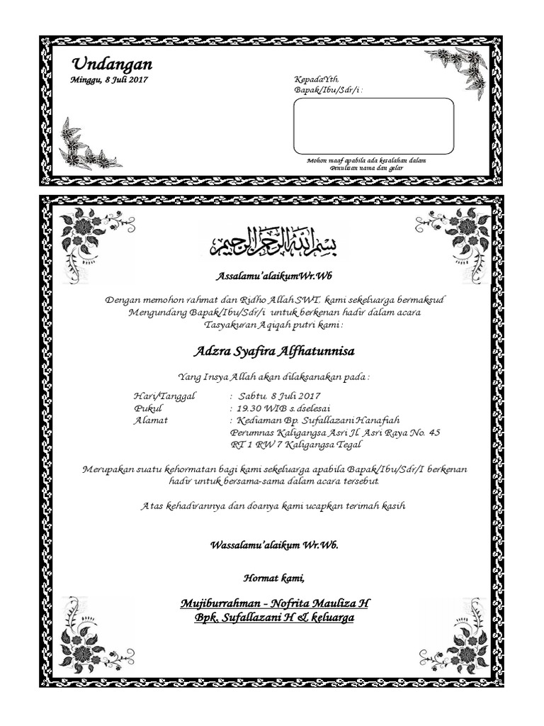 Download contoh undangan aqiqah dengan ms. Academiaedu is a platform for academics to share research papers. Semoga contoh surat ini bermanfaat untuk anda. Mohon maaf apabila banyak kesalahan dalam penulisan artikel atau informasi tersebut yang ada kaitannya dengan edit undangan aqiqah. Secara bahasa aqiqah berarti rambut yang berada di kepala bayi yang baru dilahirkan dan aqiqah juga berarti pemotongan. Contoh undangan aqiqah aqiqah adalah hewan sembelihan untuk anak laki laki atau perempuan yang baru lahir sebagai wujud rasa syukur kita kepada allah swt atas karunia terindah yang telah ia berikan.