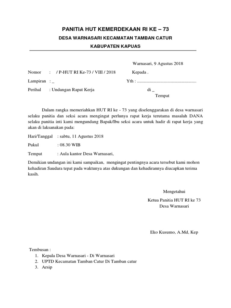 Contoh surat undangan halal bihalal untuk pembicara di perusahaan. Contoh proposal peringatan hut kemerdekaan ri ke 74 tahun 2019. Contoh pidato penutupan kegiatan diklat. Panitia hut ri ke 72 ptsta contoh undangan acara hiburan hut ri ke 73 nomor. Berikut contoh surat undangan rapat panitia hut ri 17 agustus dalam format ms word silahkan didownload pada link dibawah ini jika membutuhkannya contoh surat undangan resmi rapat ketua rt hut ri surat undangan yang dibuat dengan format yang baik serta penggunaan bahasa yang benar tentu saja akan terlihat lebih resmi dan akan lebih diperhatikan oleh warga.