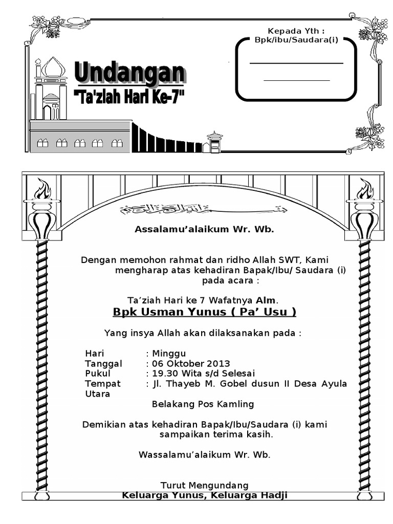 Contoh undangan takziah 7 hari. Ada banyak kumpulan undangan tahlilan baik itu tahlilan 7 hari meninggal 40 hari 100 hari hingga 1000 hari yang tersedia di internet. Tahlilan adalah salah satu bentuk kolaborasi budaya dan agama. Kami berbagi contoh surat undangan tahlil 40 100 1000 hari haul digunakan untuk acara tahlilan. 7 contoh surat undangan tahlil tahlilan 3 hari 40 hari 100 hari 1000 hari 1 tahun terlengkap surat undangan november 29 2019 0941 tahlil adalah salah satu tradisi yang sangat lekat di masyarakat muslim di indonesia. Seperti dibawah ini contohnya. Seperti ini format contoh undangan yasinan tahlilan memperingati wafatnya almarhum.